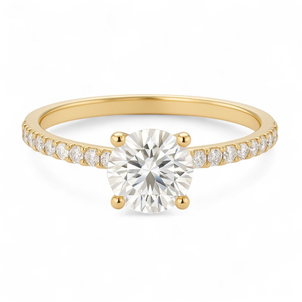 Delicate and handcrafted to perfection - 0.5 carat round cut moissanite on a slim 10k yellow gold band.