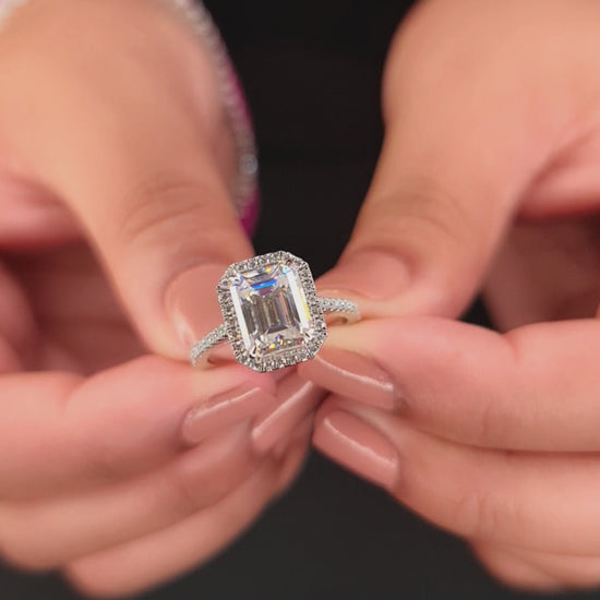 2.23 carat emerald cut moissanite in a halo setting with paved band.