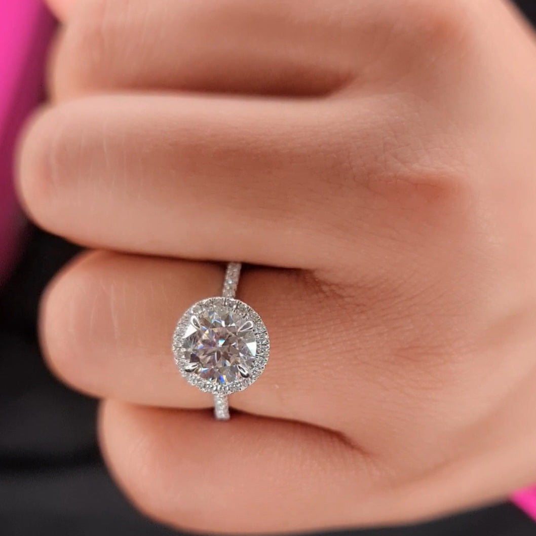 1.9 carat round brilliant cut moissanite in a halo setting with paved band.