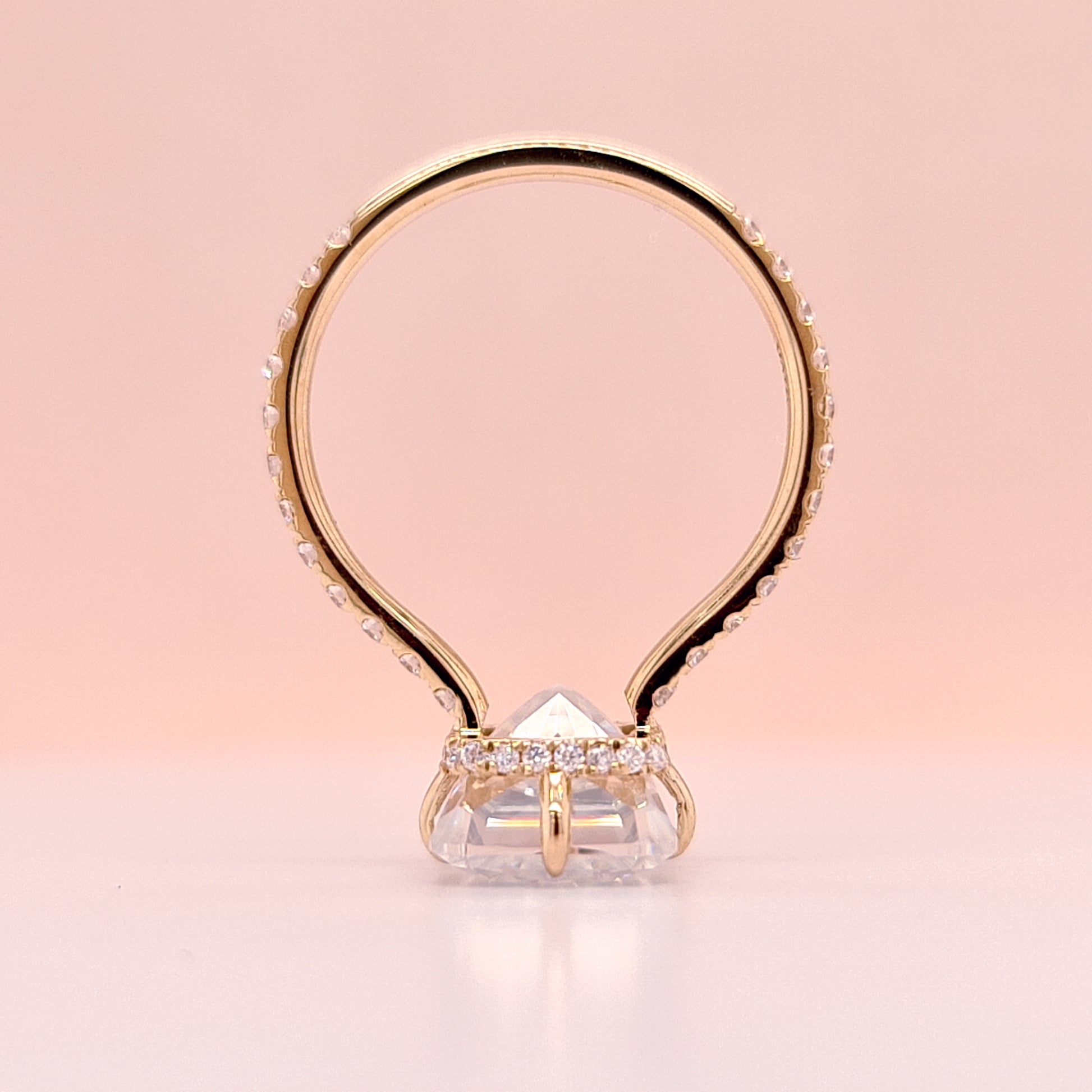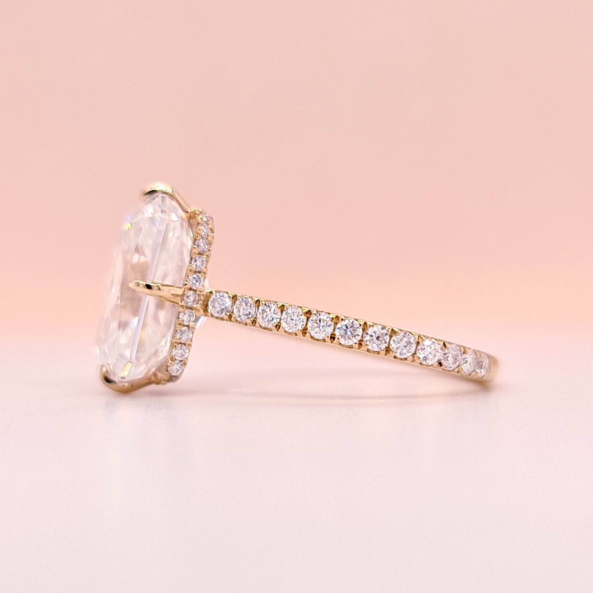 - 5.2 carat elongated radiant cut moissanite (12mm x 8.5mm), crushed ice faceting