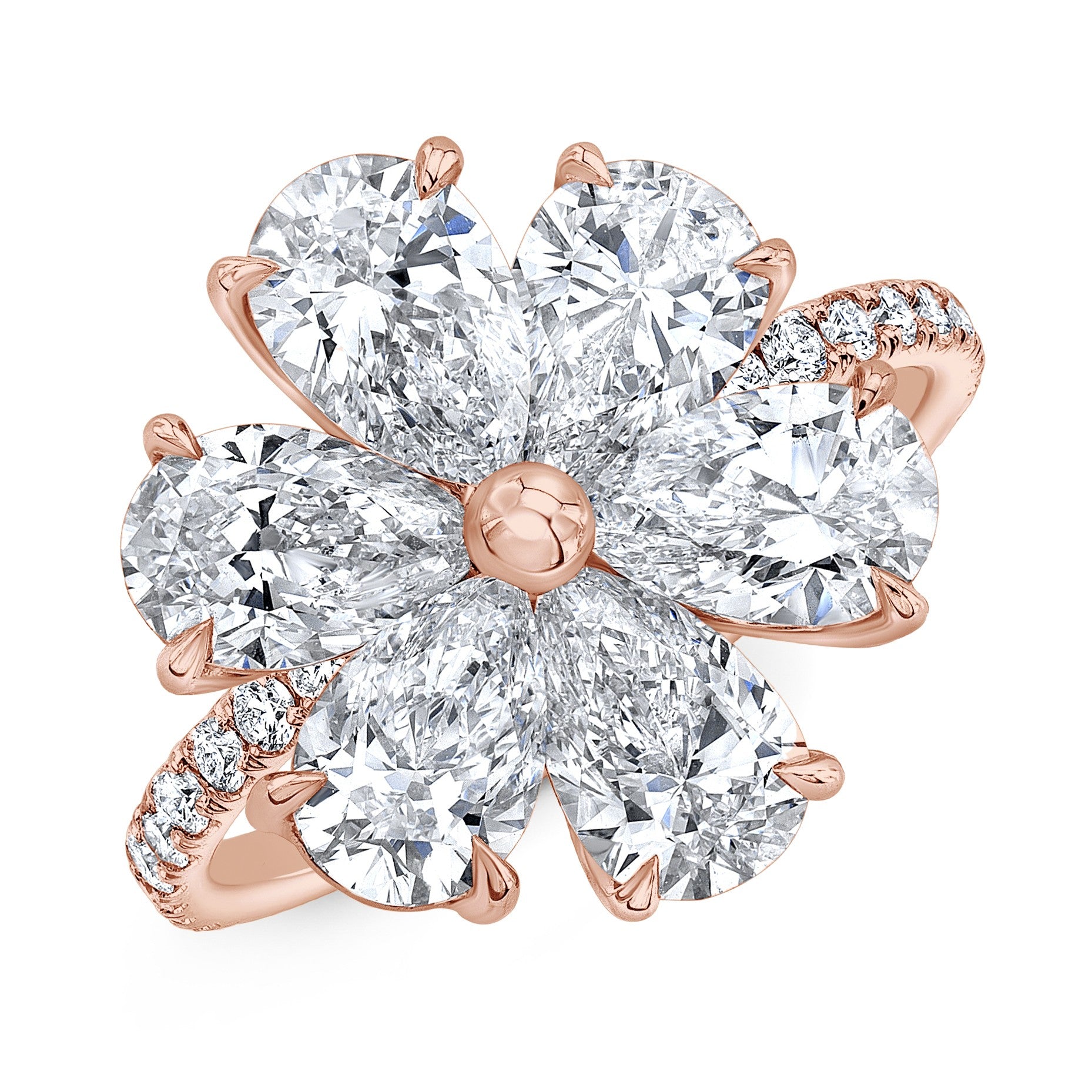 - Pear cut moissanites form the petals (approx. 0.63 ct each) - 7 x 5mm