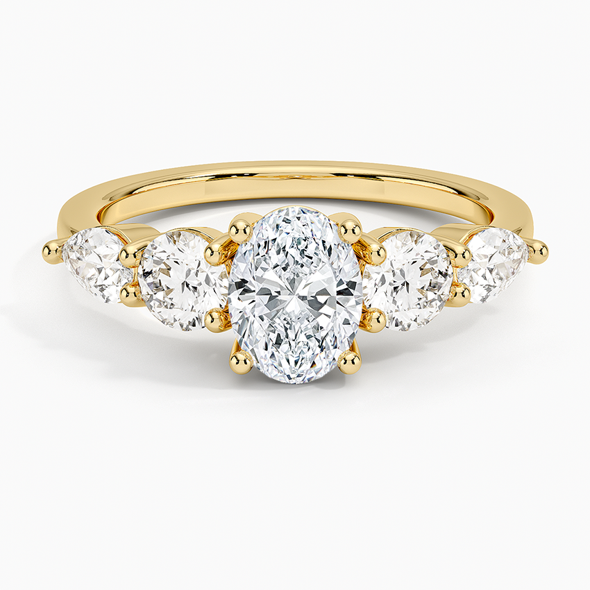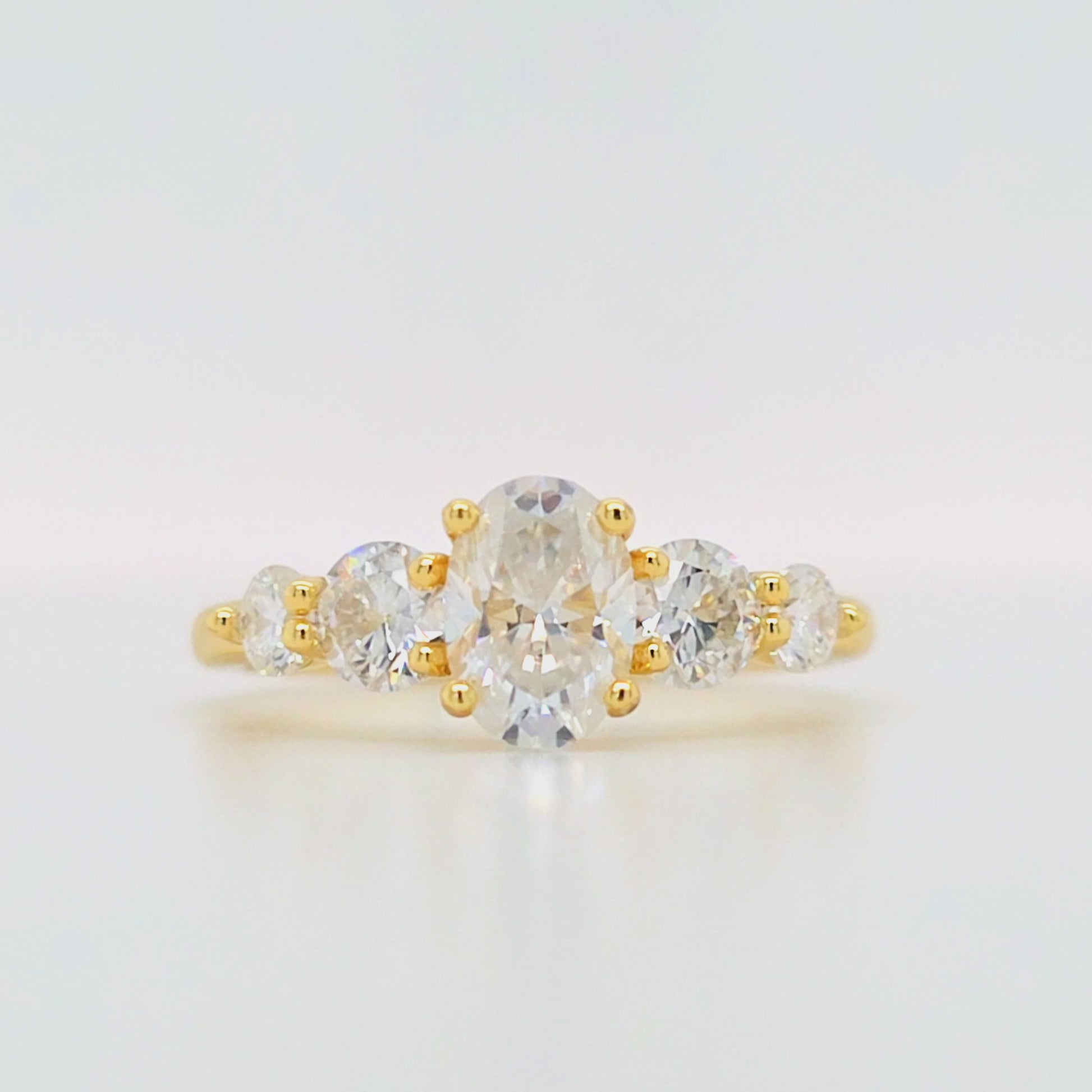 Bold yet timeless, this five-stone moissanite ring features a luminous oval centre flanked by perfectly proportioned round brilliants.