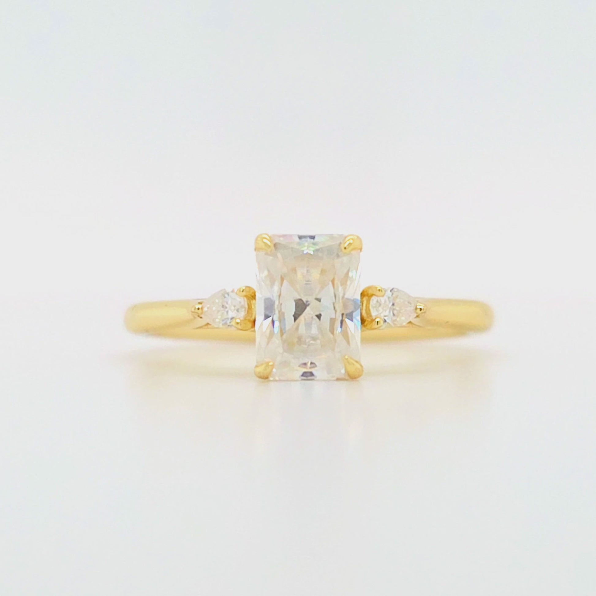 This radiant cut trilogy ring combines clean lines with timeless brilliance, featuring a captivating centre stone flanked by two pear-shaped moissanites. It’s bold, balanced, and endlessly elegant.